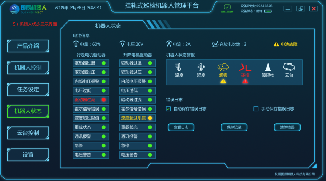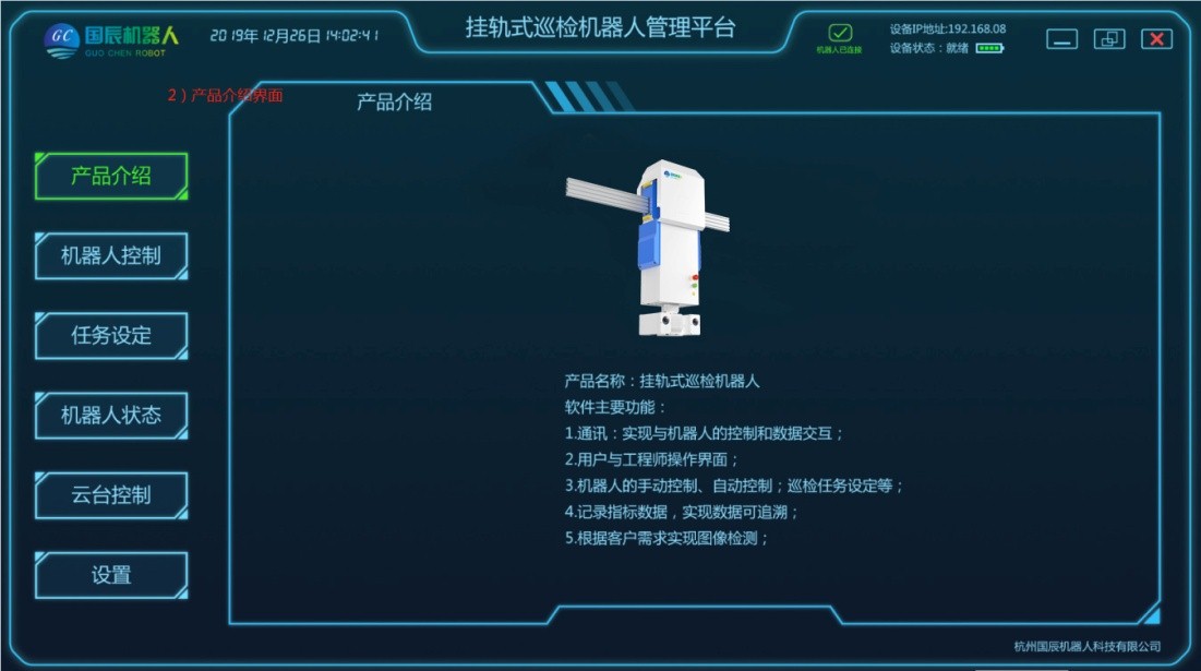 項(xiàng)目主要由移動(dòng)機(jī)器人本體、軌道系統(tǒng)、采集設(shè)備、定位系統(tǒng)、供電和通信系統(tǒng)、后臺(tái)系統(tǒng)等結(jié)構(gòu)組成。在巡檢工作過程中,由用戶設(shè)定任務(wù)點(diǎn),加裝采集設(shè)備,移動(dòng)機(jī)器人根據(jù)控制指令在軌道上運(yùn)動(dòng),將采集設(shè)備運(yùn)送到指定位置采集數(shù)據(jù),且滿足所需要的負(fù)載量,速度;在機(jī)器人行駛過程中可實(shí)現(xiàn)自主爬坡、采集設(shè)備可根據(jù)監(jiān)測物體高度進(jìn)行升降調(diào)整等功能;配套的調(diào)試軟件支持手動(dòng)、控制移動(dòng)平臺(tái)運(yùn)動(dòng);具有較強(qiáng)的適用性及拓展性,可自定義模塊搭配,自主設(shè)定任務(wù)點(diǎn),自動(dòng)巡檢、定點(diǎn)采集、自動(dòng)充電等功能。