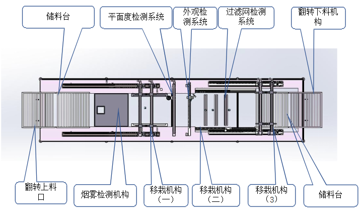 移栽機(jī)構(gòu)(二):采用模組根據(jù)產(chǎn)品調(diào)節(jié)寬距,利用模組將產(chǎn)品移動(dòng)平面、四周瑕疵、過(guò)濾網(wǎng)瑕疵工位檢測(cè)。